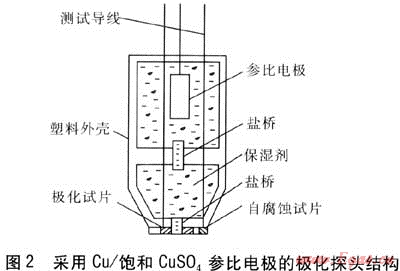 下面以Cu/飽和CuSO4參比電極探頭結(jié)構(gòu)為例進(jìn)行說明,探頭結(jié)構(gòu)見圖2。該極化探頭分為上、下兩個(gè)腔室,上腔室為參比電極安裝室,下腔室安裝有極化試片、自腐蝕試片、保濕劑,上腔室與下腔室、下腔室與極化試片通過導(dǎo)電鹽橋連接[3]。極化探頭有3根導(dǎo)線分別與參比電極、極化試片、自腐蝕試片相連接。極化試片的連接導(dǎo)線既用作試片的極化線又兼作電位的測(cè)量線。