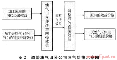 根據(jù)前面的分析可知,要真實(shí)地考察油氣田開發(fā)建設(shè)項(xiàng)目給企業(yè)帶來(lái)的經(jīng)濟(jì)效益,就必須考慮其產(chǎn)生的內(nèi)部?jī)粼鲩g接效益。在油氣田開發(fā)建設(shè)項(xiàng)目財(cái)務(wù)評(píng)價(jià)時(shí),為了真實(shí)反映內(nèi)部?jī)粼鲩g接效益給油氣田分公司各財(cái)務(wù)指標(biāo)帶來(lái)的變化,應(yīng)該調(diào)整油氣田分公司的油氣價(jià)格,以及整個(gè)分公司的稅后利潤(rùn)。為分析問(wèn)題方便起見,把考慮油氣田內(nèi)部?jī)粼鲩g接效益后的價(jià)格稱之為效益價(jià)格,調(diào)整思路如圖2所示。