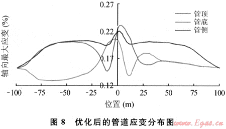 由2.2.1.2分析可知,該埋地管道的溝寬取1.9m比較經(jīng)濟(jì)。此時(shí)埋地管道的埋深取1.8m,管溝坡度取1:1,管溝內(nèi)采用彈性模量為1×105Pa的土壤回填。在上述條件下重新計(jì)算管道的應(yīng)變(見圖8),和圖5比較可知,管道最大拉伸應(yīng)變由0.33%降低到0.24%,降低了27.27%。