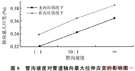 改變管溝坡度,計(jì)算得到的管道軸向最大拉伸應(yīng)變值如圖6所示。計(jì)算結(jié)果表明:隨著管溝坡度的增大,管道所受的軸向拉伸應(yīng)變分別以5.30%和7.01%的速率增大。