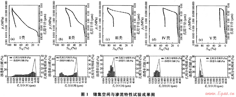 多數(shù)樣品孔隙半徑小于0.1μm,為微孔喉,占54.04%,大于0.5μm的為大孔喉僅為7.52%,0.1~0.5μm之間的為中小孔喉占38.44%,表明該區(qū)儲層孔隙半徑以微孔喉為主,孔隙結(jié)構(gòu)有5種形式,儲層主要為Ⅰ、Ⅱ、Ⅲ類;火山巖儲層巖心排驅(qū)壓力平均為7.63MPa,其中排驅(qū)壓力較小聲d<1MPa的樣品占17.55%,pd在1~5MPa的樣品占47.35%,最大汞飽和度平均為68.14%,剩余汞飽和度平均49.34%,退出效率為36.22%,反映研究區(qū)連通性好的樣品比例較低,孔喉比較大,連通孔隙的平均孔喉少,孔隙大小的均一程度較差,表明巖心中孔隙與喉道的尺寸大小不均勻(圖1)[4]。