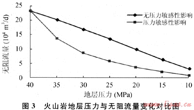 巖心實(shí)驗(yàn)表明,火山巖儲(chǔ)層具有很強(qiáng)的壓力敏感性。以實(shí)驗(yàn)數(shù)據(jù)為基礎(chǔ)數(shù)據(jù),假定儲(chǔ)層有效厚度50m,流動(dòng)半徑700m,未考慮壓裂改造影響,采用擬穩(wěn)態(tài)氣井產(chǎn)能公式,分別計(jì)算了無(wú)壓敏影響和有壓敏影響下的氣井產(chǎn)能變化情況,從計(jì)算結(jié)果看(圖3),在考慮壓敏影響下隨著地層壓力的下降,氣井產(chǎn)能與無(wú)壓敏影響下的產(chǎn)能有較大的差距,最高損失達(dá)到70%。