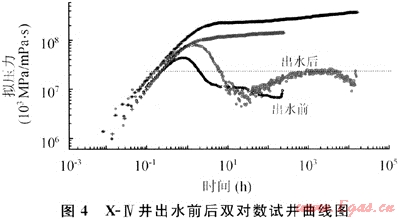 由于啟動(dòng)壓力梯度的影響,許多井試井解釋出的邊界可能就是這種由于存在著啟動(dòng)壓力梯度現(xiàn)象而導(dǎo)致的高低滲透層之間的不流動(dòng)邊界。在實(shí)際的開(kāi)發(fā)中,隨著時(shí)間的延續(xù),流動(dòng)區(qū)域地層壓力的下降,原來(lái)未動(dòng)用的低滲區(qū)域可以得到動(dòng)用。從試采時(shí)間較長(zhǎng)的X-Ⅲ井的一年半時(shí)間內(nèi)的先后兩次關(guān)井壓力恢復(fù)試井解釋看,存在著流動(dòng)區(qū)域擴(kuò)大的趨勢(shì),解釋的流動(dòng)區(qū)域的范圍擴(kuò)大了40m左右。