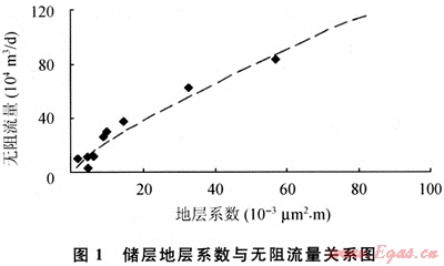 試采表明,氣井產(chǎn)能與可流動(dòng)區(qū)域的地層系數(shù)具有一定的相關(guān)性,氣井的無(wú)阻流量隨著地層系數(shù)的增加而增大(圖1)。同樣儲(chǔ)層有效流動(dòng)區(qū)域的過(guò)膜也影響到氣井的產(chǎn)能,規(guī)模越大,單位壓降下的采氣量也就越高。