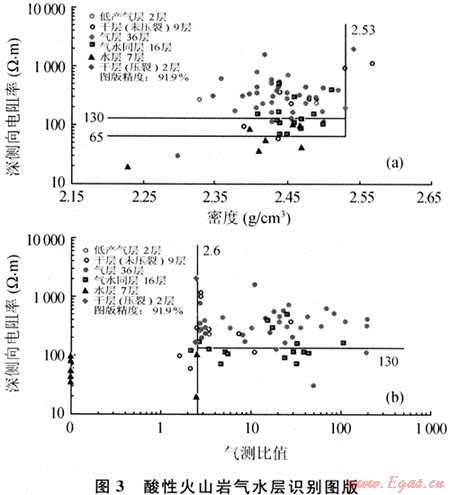 在儲(chǔ)層“四性”關(guān)系研究的基礎(chǔ)上,通過敏感性分析,確定了最能反映儲(chǔ)層流體性質(zhì)特征的參數(shù)電阻率、密度和氣測(cè)比值,建立了酸性火山巖氣水層解釋圖版(圖3),圖版精度都超過90.0%,達(dá)到了儲(chǔ)量規(guī)范的要求。