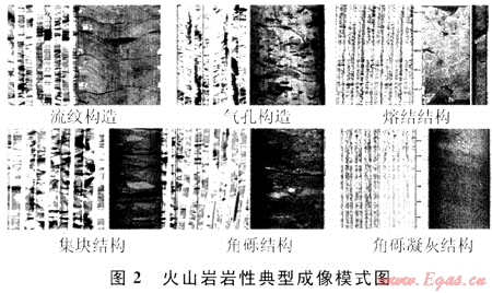 徐深氣田火山巖巖性成因復(fù)雜,即使巖石化學(xué)成分相同,但如果結(jié)構(gòu)、構(gòu)造不同,其巖石類型也會(huì)不同。而應(yīng)用交會(huì)圖版法雖然可以識(shí)別成分不同的巖性(如酸性巖、中性巖和基性巖等),但對(duì)于成分相同、而結(jié)構(gòu)或構(gòu)造不同的巖性如流紋質(zhì)熔結(jié)凝灰?guī)r、角礫凝灰?guī)r、火山集塊巖、火山角礫巖這些火山巖巖性識(shí)別效果較差,對(duì)這類巖性必須結(jié)合成像測(cè)井進(jìn)行識(shí)別。圖2為火山巖典型成像模式圖。