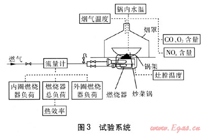 為研究負(fù)荷、鍋架相對高度(鍋架頂部距外圈燃燒器頂部的距離)、鍋架開口寬度對熱效率及煙氣的影響,筆者在采用節(jié)能環(huán)保型燃燒器基礎(chǔ)上,進(jìn)行了一系列試驗(yàn)研究。試驗(yàn)用氣源為天然氣,壓力為2kPa。以三眼中餐炒菜灶作為試驗(yàn)灶具,其單個(gè)燃燒器負(fù)荷為30kW,采用尖底炒菜鍋。試驗(yàn)系統(tǒng)見圖3。