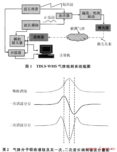 技術,其系統(tǒng)框圖見圖1。圖1中采用加法器將高頻正弦調(diào)制信號同低頻調(diào)諧信號結合起來,作為激光器的驅(qū)動電流,在光電探測器將氣體吸收之后的光信號轉變?yōu)殡娦盘栞敵霾⒂面i相放大器進行相敏檢波,從而獲得被測氣體吸收譜線的諧波分量。圖2為氣體分子吸收譜線及其一次、二次波長調(diào)制諧波分量的示意圖。