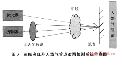 激光器輸出的1650nm的激光(甲烷氣體在1650nm附近存在強吸收譜線)經(jīng)過放大功率為1W的拉曼放大器放大后,照射在地表上,地表附近泄漏出的甲烷氣團對激光吸收后,剩余的激光照射在陸地表面,經(jīng)反射、散射之后的激光再次通過甲烷氣團,然后通過一個大的菲涅爾透鏡會聚到光電探測器上。該系統(tǒng)在100~150m的探測范圍內(nèi)可以獲得71.4mg/m3的探測靈敏度,系統(tǒng)信噪比大于3[5]。能夠?qū)崿F(xiàn)復雜環(huán)境下天然氣輸送管道泄漏的高靈敏度檢測。英國蘇格蘭天然氣管道系統(tǒng)采用上述方法進行天然氣泄漏檢測,但是此項技術目前在我國還沒有正式的應用。