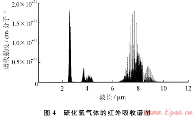 現(xiàn)有的硫化氫檢測多采用化學方法,需要將儀器放在硫化氫氣體中或者對環(huán)境中的氣體進行采樣來分析其濃度,既無法保證實時監(jiān)測,同時威脅到檢測人員的安全。而遠距離紅外甲烷檢測技術同樣可以用在對硫化氫的遠距離實時探測上。從HITRAN 2008[1]氣體分子紅外吸收光譜數(shù)據(jù)庫可以知道,硫化氫在2.6μm和7.7μm附近有較強的吸收帶,在4μm處有相對較弱的吸收譜(圖4)。在空氣中檢測隨天然氣泄漏的硫化氫氣體,首先要克服空氣中的水蒸氣和殘余的甲烷氣體的干擾。水蒸氣在2.6μm處存在強吸收譜,同時甲烷在7.65μm也存在比硫化氫吸收強度大幾十倍的吸收譜線。
