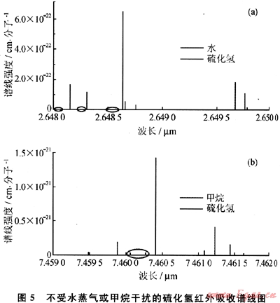 對泄漏在空氣中的硫化氫氣體進行遠距離檢測,空氣中殘留的甲烷、水蒸氣的干擾不可忽略。紅外光譜是分子振動轉動的特征譜線,不同分子因為化學鍵的不同,具有不同波長的吸收譜。同時氣體分子的吸收光譜并不是連續(xù)分布的,而是在一個波長范圍里離散的存在。譜線的寬度受到壓力的影響而有不同程度的展寬,在不同的壓力下具有高斯、Voigt或者洛倫茲分布。氣體分子的吸收譜線之間可以因為相近而存在交疊,或者由于分布較遠而留有空白區(qū)。因此,通過詳細分析水蒸氣、甲烷、硫化氫氣體在不同波長下吸收譜線之間的交疊情況,來選擇不受或者受水蒸氣、甲烷吸收譜線影響較小的硫化氫吸收譜線,并以此來進行檢測,從而確定出所要采用的光源波長、類型以及檢測方法等。圖5給出了根據(jù)HITRAN 2008分子光譜數(shù)據(jù)庫對硫化氫、水蒸氣和甲烷分子吸收譜線進行分析之后選定的硫化氫吸收譜線,圈中的譜線為硫化氫吸收譜線附近的弱吸收強度的水蒸氣或甲烷吸收譜線。從圖5可以看出,硫化氫在2.64μm(圖5-a)和7.46μm(圖5-b)附近能夠得到不受水蒸氣或甲烷明顯干擾的吸收譜線,用來實現(xiàn)紅外硫化氫檢測。