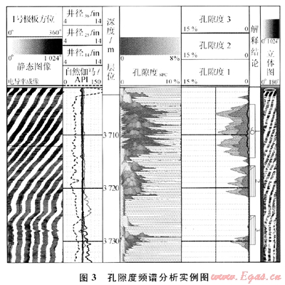 成像測井可提供大量的信息用于地層定性、定量評價,GeoReveal成像處理軟件可完成傾角處理、地質(zhì)特征人工交互解釋以及聲波成像井眼穩(wěn)定性分析(圖2)等信息的提取,而且具有裂縫參數(shù)計算、特殊巖性體積含量計算以及孔隙度頻譜分析等一系列定量評價模塊。