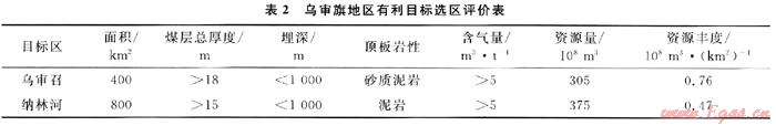 根據(jù)上述分析,按照煤層總厚度大于10m,埋深在1000m以淺,煤層頂板為泥巖、砂質(zhì)泥巖,煤層含氣量大于5m3/t等選區(qū)評(píng)價(jià)標(biāo)準(zhǔn),綜合分析各個(gè)區(qū)塊的煤層氣地質(zhì)條件,結(jié)論認(rèn)為:北部烏審召區(qū)塊和南部納林河區(qū)塊是煤層氣有利勘探目標(biāo)區(qū),2個(gè)區(qū)塊含煤總面積為1200km2,煤層氣資源量達(dá)680×108m3(圖3、表2)。