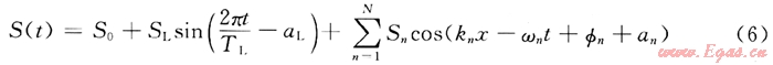 使用描述波浪的郎格-赫金斯(Longuet-Higgins)模型,波浪可由若干個(gè)不同周期、不同波高、不同相位角的簡(jiǎn)單余弦波進(jìn)行線性疊加來(lái)模擬。長(zhǎng)峰波浪可以表示為: