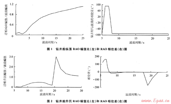 鉆井船的響應(yīng)幅值算子(Response Amplitude Operator,簡(jiǎn)稱(chēng)RAO)可以用來(lái)模擬鉆井船對(duì)特定波的響應(yīng)。響應(yīng)幅值算子包括幅值傳遞函數(shù)與相位傳遞函數(shù)。前者確定了不同波浪周期時(shí),鉆井船響應(yīng)與對(duì)應(yīng)組成波的幅值比;后者確定了不同波浪周期時(shí),鉆井船響應(yīng)與對(duì)應(yīng)組成波的相位差。圖1中是鉆井船縱蕩RAO幅值比和相位差。
