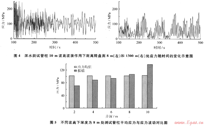 從圖4、5可知:隨著波高的增大,測(cè)試管柱的應(yīng)力的波動(dòng)增大,而且測(cè)試管柱應(yīng)力波動(dòng)的幅度也增大;在不同波高下測(cè)試管柱應(yīng)力的平均值則基本不變。