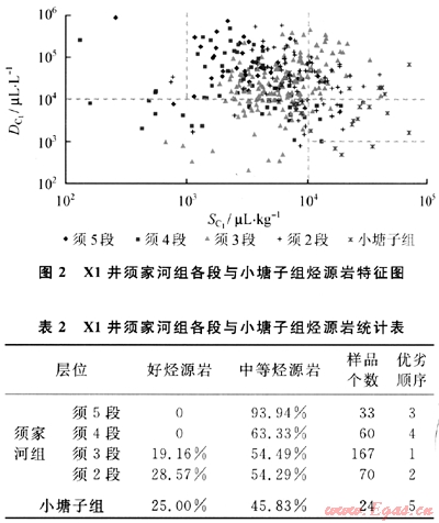 X1井粉砂質(zhì)頁巖、頁巖、碳質(zhì)頁巖和煤層全部分布于須家河組和小塘子組。根據(jù)標準發(fā)現(xiàn)須5段和須4段以中等烴源巖為主,無好烴源巖;須3段、須2段和小塘子組以中等烴源巖為主,好烴源巖相對豐富(圖2)。根據(jù)好烴源巖與中等烴源巖之和對烴源巖優(yōu)劣進行排序,認為須3段最優(yōu)、須2段其次、須5段和須4段較差、小塘子組最差(表2)。此認識與劉華等2002年對四川盆地上三疊統(tǒng)有機碳含量的研究成果相符[3]。