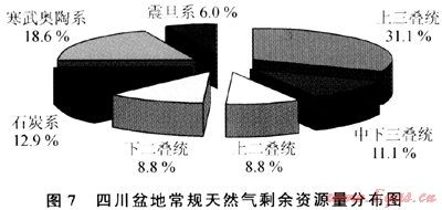 四川盆地天然氣資源豐富,盆地天然氣資源量為10.6×1012m3,按盆地現(xiàn)有探明儲量計算,探明率僅19.5%。隨著新技術推廣應用和認識深化,盆地二疊系長興組、三疊系飛仙關組礁灘以及三疊系須家河組勘探相繼獲得重大突破,資源量還將有較大增長,資源潛力很大。從待發(fā)現(xiàn)資源分布來看,以上三疊統(tǒng)為最多,占31.1%;其次為中下三疊統(tǒng)-上二疊統(tǒng),占19.9%(圖7)。此外,四川南部地區(qū)下古生界海相頁巖氣資源豐富,初步估算寒武系筇竹寺組和志留系龍馬溪組頁巖氣資源量在4×1012m3以上。這些領域都是四川盆地下一步勘探開發(fā)的重點,也是盆地天然氣持續(xù)上產(chǎn)的重要方向。