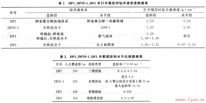 DP1井鉆遇煤層時有大塊煤層掉塊帶出??逅蛑饕ǎ孩倜簩幼陨硖匦裕簭姸鹊汀⑺?、脆,易垮塌;②DF1井造斜段揭開煤層時鉆井液密度低,不足以平衡煤層的垮塌;③鉆井液體系抑制性不夠;④氮氣泡沫循環(huán)介質(zhì)無法滿足井眼穩(wěn)定的要求。