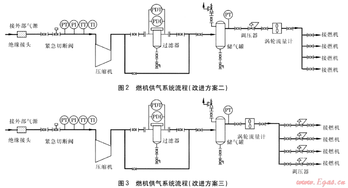 方案三:改進(jìn)思路與方案二相同,即在原系統(tǒng)中增加燃?xì)庹{(diào)壓器。本方案中調(diào)壓器不是設(shè)在儲氣罐之后,而是設(shè)在每臺燃機(jī)的燃料進(jìn)口處,壓縮機(jī)的設(shè)定壓力與方案二相同。本方案的工藝流程見圖3。