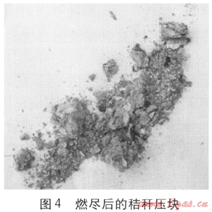 混燒不僅改善了燃煤的著火性能,還改善了主燃區(qū)燃料層內(nèi)空氣與燃料的混合。秸稈壓塊在冷態(tài)情況下是致密的塊狀結(jié)構(gòu),受熱時(shí)揮發(fā)分析出,自身將成為疏松的孔狀結(jié)構(gòu),且膨脹、體積增大。由圖3可以觀察到燃料層表層的體積膨脹后的秸稈壓塊。燃盡后的秸稈壓塊見(jiàn)圖4,其結(jié)構(gòu)是疏松多孔狀的。