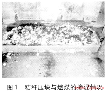 與煤混燒的是花生秧秸稈壓塊,其形狀為長(zhǎng)方體,尺寸為30mm×30mm×70mm,運(yùn)輸過(guò)程造成少量壓塊破碎成小塊,但粉末狀顆粒所占比例可忽略。由于成型過(guò)程中添加劑的影響,秸稈壓塊中灰的質(zhì)量分?jǐn)?shù)約15%,低位發(fā)熱量約14562kJ/kg?;鞜^(guò)程中,秸稈壓塊與燃煤的摻混比例(質(zhì)量比)為20%~30%。采用人工摻混,煤斗內(nèi)的混合情況見(jiàn)圖1,兩者混合比較均勻。