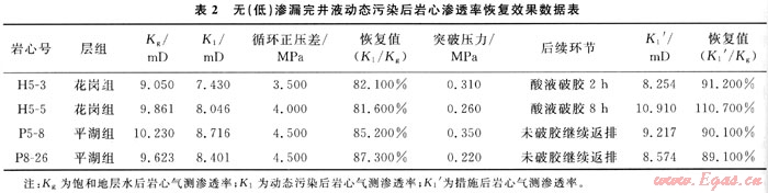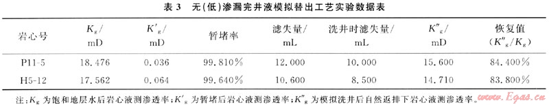 滲透率恢復(fù)值為120~130,但有沉淀、分層和絮凝,說(shuō)明與地層水的配伍性良好。但是為考察無(wú)(低)滲漏完井液體系在高溫作用下的保護(hù)儲(chǔ)層效果即巖心滲透率恢復(fù)值情況,選取目標(biāo)層4塊巖心進(jìn)行完井液動(dòng)態(tài)污染實(shí)驗(yàn),實(shí)驗(yàn)溫度為120~130℃,動(dòng)態(tài)循環(huán)正壓差為3.5~4.5MPa,實(shí)驗(yàn)數(shù)據(jù)見表2。