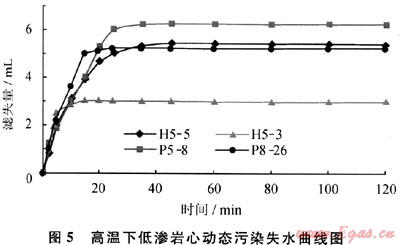 濾失性無(wú)(低)滲漏完井液體系在動(dòng)態(tài)污染試驗(yàn)的前20min,5塊巖心動(dòng)態(tài)失水速率普遍較大,這可能是因?yàn)檐涱w粒狀完井液受擠壓時(shí)發(fā)生的物理脫水現(xiàn)象,但總量均沒(méi)有超過(guò)7mL。20min左右,致密的碳化膠質(zhì)暫堵層逐漸形成,加上軟顆粒本身的物理暫堵功能,雙重暫堵下巖心基本不再發(fā)生濾失(圖5),說(shuō)明無(wú)(低)滲漏完井液高溫下與巖心接觸時(shí)發(fā)生的化學(xué)質(zhì)變有利于控制完井液的失水滲漏。從濾失量減少為0的時(shí)間可看出,膠質(zhì)暫堵層在120~130℃下形成的時(shí)間在20min左右,最低的約6min,如H5-3號(hào)巖心,6min左右濾失量就降至為0,這可能與巖心中的黏土礦物類型和總含量有關(guān)。
