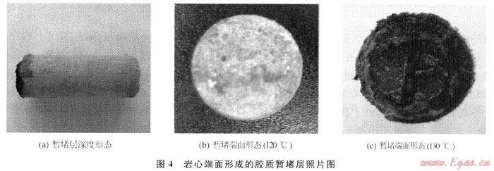 從表2中實(shí)驗(yàn)數(shù)據(jù)可知:低滲巖心自然反排的突破壓力較低,均小于0.4MPa,滲透率恢復(fù)值均超過(guò)80%,如果反排時(shí)間繼續(xù)延長(zhǎng),巖心滲透率恢復(fù)值還可繼續(xù)得以恢復(fù),無(wú)(低)滲漏完井液所形成的暫堵層完全可以自然解堵,在完井和修井結(jié)束后,無(wú)論采用連續(xù)油管或氣舉都很容易誘噴解堵。用酸液破膠后,巖心的滲透率恢復(fù)值會(huì)繼續(xù)增加,甚至可超過(guò)100%,但對(duì)于低滲透氣藏,為減少液相部分滯留而造成水相圈閉損害,不推薦采用酸液破膠。另外,實(shí)驗(yàn)中有了新發(fā)現(xiàn):巖心端面在高溫下形成了一種黃至黑色膠質(zhì)致密暫堵層,有一定強(qiáng)度,不能用手輕易刮開,深度約3mm(圖4-a),且隨著實(shí)驗(yàn)溫度增加暫堵層顏色加深(圖4-b、c),認(rèn)為是有機(jī)高分子完井液在接觸巖心時(shí)發(fā)生碳化(熱催化)反應(yīng)所得,這與新型完井液體系的構(gòu)建思路基本一致。