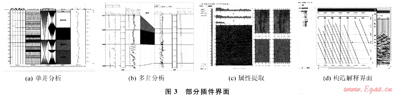 井分析插件包括合成記錄、地質(zhì)層位標(biāo)定、AVO分析、流體替換、交會(huì)分析等單井分析以及地層對(duì)比、砂體對(duì)比分析等多井分析功能。構(gòu)造解釋插件主要包括速度場(chǎng)構(gòu)建、2D/3D構(gòu)造解釋、全三維可視化解釋、時(shí)深轉(zhuǎn)換等。屬性儲(chǔ)層預(yù)測(cè)插件包括常規(guī)屬性及特殊屬性提取、屬性優(yōu)化、儲(chǔ)層預(yù)測(cè)。地質(zhì)繪圖插件包括數(shù)據(jù)網(wǎng)格化、等值線繪制、構(gòu)造成圖等功能。圖3為插件的部分界面。