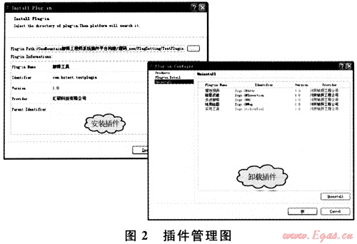 插件平臺(tái)是整個(gè)系統(tǒng)的核心,是功能插件實(shí)現(xiàn)的基礎(chǔ)。插件平臺(tái)包含重要的核心組件,分別有運(yùn)行時(shí)核心、工作臺(tái)GUI、項(xiàng)目管理、幫助系統(tǒng)數(shù)據(jù)管理和平臺(tái)數(shù)據(jù)業(yè)務(wù)等。插件平臺(tái)不包含具體的功能實(shí)現(xiàn),只為功能插件提供運(yùn)行環(huán)境、實(shí)現(xiàn)接口及數(shù)據(jù)管理,而插件實(shí)現(xiàn)其業(yè)務(wù)功能要依賴平臺(tái)接口。插件通過(guò)平臺(tái)安裝的方式安裝入平臺(tái)中,同時(shí)平臺(tái)也提供插件管理功能,如卸載插件等(圖2)??梢院芎玫亟鉀Q軟件開(kāi)發(fā)與集成問(wèn)題,適用高級(jí)版和低級(jí)版的軟件安裝,這對(duì)程序組織開(kāi)發(fā)十分方便。軟件系統(tǒng)采用C++語(yǔ)言的跨平臺(tái)GUI工具包QT開(kāi)發(fā)[2~3],可運(yùn)行于Windows、Linux、Unix等多個(gè)平臺(tái)之上。