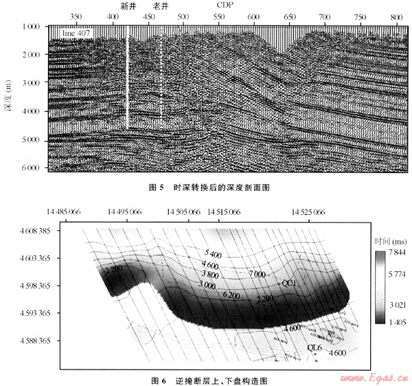 GeoMountain解釋軟件系統(tǒng)在10多個(gè)項(xiàng)目中得到了廣泛應(yīng)用,取得較好效果。圖4為西部某工區(qū)構(gòu)建的地下速度模型,經(jīng)時(shí)深轉(zhuǎn)換后得到深度剖面。由于準(zhǔn)確的速度場(chǎng)構(gòu)建,消除了時(shí)間剖面的構(gòu)造假象,恢復(fù)了地下復(fù)雜構(gòu)造的真實(shí)形態(tài)(圖5)。圖6為某層的逆掩斷層構(gòu)造成圖,它同時(shí)刻畫(huà)了斷層上、下盤(pán)包括逆掩部分的構(gòu)造形態(tài)。