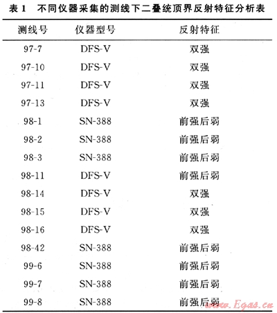 表1列出了不同年度、不同儀器采集的部分二維疊加剖面下二疊統(tǒng)頂界反射特征。從表1中看出:SN-388采集的大多數測線陽新統(tǒng)頂界反射特征為前強后弱的單強相位,與三維剖面下二疊統(tǒng)頂界反射為單強相位特征相近。而DFS-V數字地震儀采集的大多數測線下二疊統(tǒng)頂界反射特征為雙強相位。由此得出:DFS-V儀器采集的二維資料與三維資料特征不一致,反射特征差異是由儀器響應的不同而引起的。
