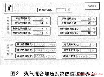 在這個(gè)控制系統(tǒng)中,高爐煤氣的熱值、焦?fàn)t煤氣的熱值、混合煤氣的給定熱值、閥門調(diào)節(jié)的周期、閥門調(diào)節(jié)的步長(zhǎng)都可以在操作界面上直接輸入,見圖2。此控制系統(tǒng)使用起來(lái)非常方便,調(diào)節(jié)后的熱值也可以即時(shí)顯示。通過(guò)WCC系統(tǒng)軟件,可以調(diào)出任何時(shí)刻的煤氣混合情況。