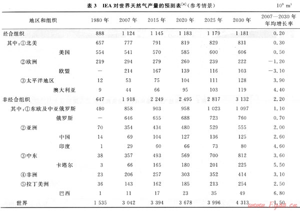 對(duì)天然氣已探明儲(chǔ)量的認(rèn)識(shí)大家比較一致,對(duì)于已知?dú)馓锏膬?chǔ)量增長量、待發(fā)現(xiàn)天然氣的常規(guī)資源量和非常規(guī)資源量有許多機(jī)構(gòu)和學(xué)者做過預(yù)測(cè)。在此基礎(chǔ)上國際能源署(IEA)在2008年對(duì)世界天然氣產(chǎn)量進(jìn)行了預(yù)測(cè)(表3)。