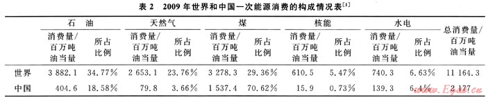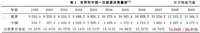 世界一次能源消費(fèi)量除2009年的金融危機(jī)造成下降外,其他各年均逐漸上升,10年總計(jì)上升了12.4%。中國的一次能源消費(fèi)量,一直處于上升狀態(tài),金融危機(jī)也沒有影響其上升的勢(shì)頭(表1),10年總計(jì)上升了133%。中國的一次能源消費(fèi)量從1999年占世界的10.3%提高到2009年的19.5%,共提高了9.2個(gè)百分點(diǎn),成為全球一次能源消費(fèi)量增長最快的國家。中國正處于工業(yè)化和城市化發(fā)展階段,未來一次能源消費(fèi)量仍將快速增長,對(duì)中國能源供給能力產(chǎn)生了巨大的壓力,化石能源消費(fèi)量在相當(dāng)長的時(shí)間內(nèi)仍將增長。