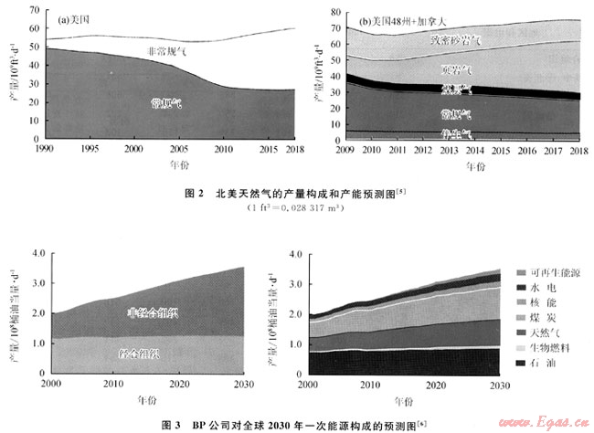 美國對(duì)頁巖氣的評(píng)價(jià)技術(shù)和開采技術(shù)已經(jīng)比較成熟,而且采氣的成本也較低,有可能在全球推廣。從而可以得出一個(gè)重要的推論:世界頁巖氣分布廣泛,開采技術(shù)成熟,使全世界有商業(yè)價(jià)值的天然氣資源量大幅度增加,未來全世界的天然氣產(chǎn)量也可能大幅度增加,其增長速度可能大于IEA預(yù)測(cè)的1.5%。據(jù)BP預(yù)測(cè),全球2030年天然氣在一次能源構(gòu)成中的比例將與石油接近(圖3)。