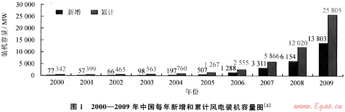 要完成上述指標(biāo)的任務(wù)十分艱巨。一次能源總需求量仍在高速增長,預(yù)計(jì)完成工業(yè)化在2030年左右,這段時(shí)間內(nèi)化石能源總產(chǎn)量不僅不可能下降,反而仍將繼續(xù)上升??稍偕茉春秃四茉?009年占總能源消費(fèi)的7.13%,要達(dá)到2020年的目標(biāo),需要提高7.87%。目前來看核電最為現(xiàn)實(shí),而太陽能和風(fēng)能的間歇性、不容易控制和難以儲(chǔ)存等問題在技術(shù)上尚未得到圓滿解決,成本也較高。如風(fēng)能近幾年發(fā)展十分迅速,2009年裝機(jī)總?cè)萘恳堰_(dá)25805MW[2](圖1),但發(fā)電量卻僅為裝機(jī)容量的12%(269×108kWh)。太陽能熱發(fā)電比燃煤發(fā)電的用水量多68%。僅僅依靠核能和可再生能源實(shí)現(xiàn)一次能源總量增長和C02減排,也存在相當(dāng)大的困難。