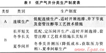 基于上述對(duì)低產(chǎn)井的精細(xì)分類,通過(guò)結(jié)合泡沫排水采氣、井下節(jié)流等配套工藝技術(shù)措施,制訂出了低產(chǎn)井的合理生產(chǎn)制度(表5),并逐漸形成了榆林南區(qū)低產(chǎn)井開(kāi)發(fā)管理模式[4]。
