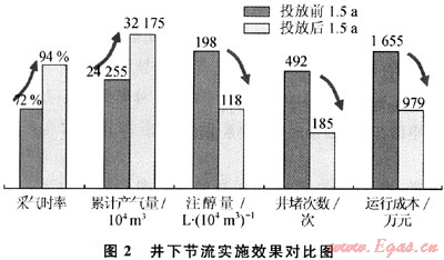 在氣井生產(chǎn)中,低產(chǎn)低效氣井的井口氣流溫度較低,部分井產(chǎn)液量較多,在采氣樹(shù)處和地面管線很容易發(fā)生水合物冰堵,如果冰堵次數(shù)較多,會(huì)大大影響氣井的開(kāi)井時(shí)率,降低氣井的產(chǎn)能,同時(shí)員工頻繁的放空解堵,既增加了作業(yè)風(fēng)險(xiǎn),又增加了環(huán)境污染。為此,結(jié)合井下節(jié)流技術(shù),選擇一些壓力高、井溫低、產(chǎn)液量多,井堵頻繁的氣井,下井下節(jié)流器,降低井口的壓力,提高氣井的攜液能力,降低了井堵的頻次(圖2)。此項(xiàng)工藝技術(shù)在榆林南區(qū)應(yīng)用,取得了很好的效果。