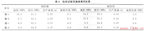 在生產(chǎn)過(guò)程中,常出現(xiàn)油套壓差增大的情況,說(shuō)明井底或井筒中有積液,如果氣井井底或井筒積液嚴(yán)重,對(duì)氣井的生產(chǎn)會(huì)帶來(lái)很大的影響。由于低產(chǎn)井的產(chǎn)能普遍比較低,部分井的產(chǎn)量不能滿足攜液要求,如果積液不及時(shí)帶出,將嚴(yán)重影響氣井連續(xù)穩(wěn)定生產(chǎn)。為了更好地發(fā)揮氣井產(chǎn)能,結(jié)合泡沫排水采氣工藝,針對(duì)油套壓差相對(duì)較大、井底或井筒中有積液的氣井,間歇性加入起泡劑,排除凝析水,延長(zhǎng)開(kāi)井周期。目前在榆林南區(qū)正大面積推廣[2~3](表4)。