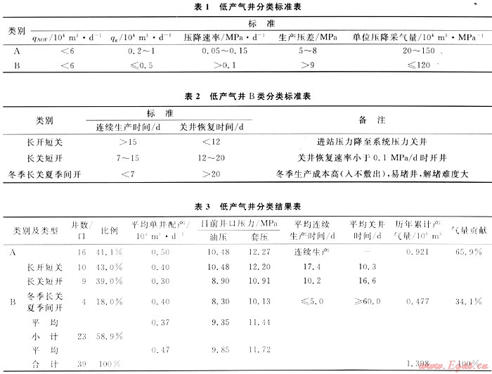 為了提高低產(chǎn)井的采氣時(shí)率和采收率,便于對(duì)氣井進(jìn)行更好地開(kāi)發(fā)與管理,依據(jù)氣井的儲(chǔ)層參數(shù),結(jié)合生產(chǎn)動(dòng)態(tài)和穩(wěn)產(chǎn)能力,對(duì)低產(chǎn)井進(jìn)行分類,實(shí)現(xiàn)低產(chǎn)井的精細(xì)管理(表1、2、3)。