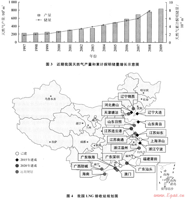 為了滿足日益增長(zhǎng)的天然氣需求,我國(guó)還將逐步加大LNG進(jìn)口力度。到目前為止,我國(guó)已建成廣東深圳LNG接收站、福建LNG接收站和上海LNG接收站,并相繼投產(chǎn)運(yùn)行。按照“資源市場(chǎng)落實(shí)、統(tǒng)籌規(guī)劃,適時(shí)、有序、適度引進(jìn)LNG資源”的原則,預(yù)計(jì)到2015年,我國(guó)LNG資源引進(jìn)規(guī)模將有望突破2000×104t。我國(guó)LNG接收站規(guī)劃如圖4所示。