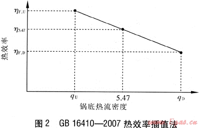 GB 16410—2007中的熱效率插值法是以鍋底熱流密度作為橫坐標(biāo),以熱效率作為縱坐標(biāo)建立直角坐標(biāo)系。當(dāng)用上限鍋測(cè)試熱效率時(shí),其橫坐標(biāo)點(diǎn)qU對(duì)應(yīng)的熱效率為ηF,U;用下限鍋測(cè)試熱效率時(shí),其橫坐標(biāo)點(diǎn)qD對(duì)應(yīng)的熱效率為ηF,D。然后以橫坐標(biāo)為5.47的豎直直線與ηF,U、ηF,D兩點(diǎn)連線的交點(diǎn)的縱坐標(biāo)值,作為此灶具燃燒器熱效率的最終結(jié)果η5.47(見圖2)。熱效率插值法是在不改變熱負(fù)荷的前提下得到的。
