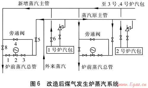 針對(duì)以上問(wèn)題,我們對(duì)蒸汽系統(tǒng)進(jìn)行了改進(jìn):①重新布置1根長(zhǎng)度為40m、外徑為108mm的無(wú)縫鋼管作為自產(chǎn)蒸汽的主管道(即新增自產(chǎn)蒸汽主管)。②將4臺(tái)煤氣發(fā)生爐汽包的出汽管與原主管分開(kāi)后,接到新增自產(chǎn)蒸汽主管上。③在新增自產(chǎn)蒸汽主管至每臺(tái)煤氣發(fā)生爐飽和管之間加1個(gè)DN 100mm的截止閥(8號(hào)閥)。④將原來(lái)旁通閥(4號(hào)閥)由截止閥改為閘閥。改造后煤氣發(fā)生爐蒸汽系統(tǒng)見(jiàn)圖6。