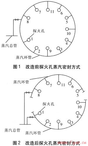 改造方案是:將原來(lái)的蒸汽環(huán)管從中間截?cái)喑蓛砂?,一半沿用原?lái)的探火蒸汽管和閥門(mén),只是將兩端用堵頭堵住,主要用來(lái)密封5、6、7、8、11號(hào)探火孔;用1根直徑為40mm的無(wú)縫鋼管從蒸汽總管引至另一半環(huán)管上,加裝1個(gè)DN 40mm的截止閥作為控制用,這一半環(huán)管主要用來(lái)密封1、2、3、4、9、10號(hào)探火孔。經(jīng)過(guò)這一改進(jìn)后,提高了密封煤氣的蒸汽壓力,解決了在探火時(shí)因蒸汽壓力較低而造成密封效果較差、煤氣泄漏嚴(yán)重的問(wèn)題。