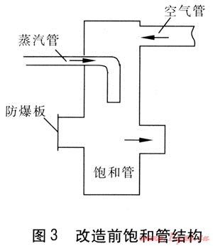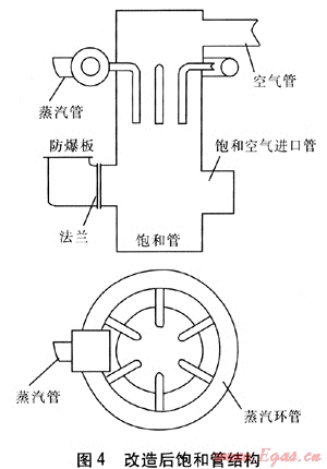 改變蒸汽進(jìn)入飽和管的方式,首先在飽和管外部加1根管徑為100mm的環(huán)形管,環(huán)形管上接1段長(zhǎng)度為200mm、直徑為200mm的緩沖管,使蒸汽在緩沖管內(nèi)得到緩沖,然后將蒸汽由6根直徑為40mm的支管引入飽和管,在每根支管上分別鉆12個(gè)直徑為14mm的孔(靠飽和管內(nèi)壁一側(cè)不鉆孔),支管末端出口用盲板堵住。改造后飽和管結(jié)構(gòu)見(jiàn)圖4。通過(guò)以上改造,實(shí)現(xiàn)了蒸汽和空氣的充分混合,提高了氣化劑的品質(zhì),從而改善了爐內(nèi)氣化狀況。