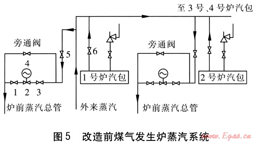 外來(lái)蒸汽的壓力一般在0.8MPa左右,經(jīng)過(guò)減壓閥減壓后最低保持在0.15MPa左右。煤氣發(fā)生爐自產(chǎn)蒸汽的壓力一般在0.045MPa左右,設(shè)計(jì)壓力不超過(guò)0.075MPa,經(jīng)過(guò)汽包匯集后與減壓后的外供蒸汽一起進(jìn)入爐前蒸汽總管。改造前煤氣發(fā)生爐蒸汽系統(tǒng)見(jiàn)圖5。由于兩者壓力之差,導(dǎo)致外供蒸汽流入煤氣發(fā)生爐汽包,造成煤氣發(fā)生爐的自產(chǎn)蒸汽無(wú)法進(jìn)入爐前蒸汽總管,汽包安全閥長(zhǎng)年處于開(kāi)啟放散狀態(tài),從而使大量的蒸汽浪費(fèi),存在汽包壓力持續(xù)超過(guò)設(shè)計(jì)要求的不安全因素。
