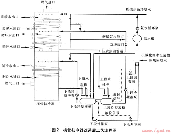⑤ 在下段冷凝液槽增設(shè)50m3/h的外排泵1臺(tái),將下段冷凝液抽到機(jī)械化氨水澄清槽,依靠泵出口調(diào)節(jié)閥自動(dòng)控制下段冷凝液槽液位在1.5~1.7m。由于下段冷凝液槽液位的降低,下段水封槽液面與下段冷凝液槽液面形成1.5m的高度差,5臺(tái)下段水封槽流下的大約550m3/h的冷凝液在進(jìn)入下段冷凝液槽時(shí),會(huì)使下段冷凝液槽內(nèi)部冷凝液充分?jǐn)噭?dòng),可防止槽內(nèi)積萘。將下段冷凝液槽外壁進(jìn)行了保溫處理,防止冬季槽壁積萘。在冬季可以將循環(huán)氨水用管道從下段冷凝液槽上部大量加入其中,以提高下段冷凝液的溫度,逐漸溶化槽內(nèi)的積萘,將溶化的沉渣及時(shí)排至機(jī)械化氨水澄清槽。橫管初冷器改造后工藝流程見(jiàn)圖2。