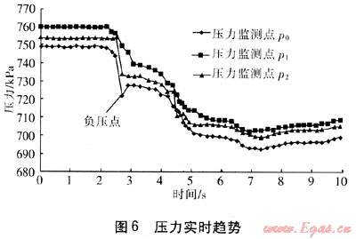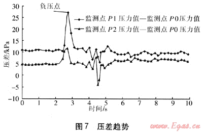 圖6為SCADA系統(tǒng)提供的壓力實(shí)時趨勢,P0是距離泄漏點(diǎn)最近的壓力測點(diǎn),P2次之,P1最遠(yuǎn)。由于負(fù)壓波傳輸需要一定的時間,P0具有明顯的負(fù)壓點(diǎn),P1和P2的負(fù)壓點(diǎn)不太明顯。圖7為壓差趨勢,通過壓差比對判定壓差波動最大的時刻發(fā)生泄漏,泄漏位置在P0附近。在試驗過程中,城市燃?xì)夤芫W(wǎng)泄漏在線檢測軟件同步運(yùn)行,得出的結(jié)果與試驗實(shí)測結(jié)果對比,即可判定出軟件的準(zhǔn)確度。
